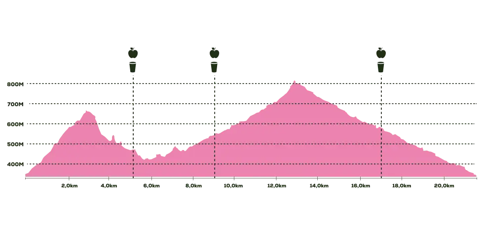 Ruta de dificultad intermedia. Recorre terrenos de superficies con desniveles más pronunciados y zonas de dificultad técnica. Apto para mayores de 18 años que realicen actividad física periódica en espacios al aire libre, como carreras, trekking o senderismo. Esta ruta cuenta con un desnivel positivo de 950m+ para todo su recorrido. TRAIL 21K Esta distancia tiene un tiempo máximo de recorrido válido de 6 horas. Si un corredor llega a la meta después de este tiempo, se le atribuirá la condición de “No Terminó” en los resultados finales.